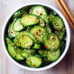 This Asian Cucumber Salad is a cool, refreshing side dish featuring thinly sliced cucumbers tossed in a tangy dressing of rice vinegar, soy sauce, sesame oil, ginger, garlic, and a touch of chili for heat. It’s vegan, gluten-free, and perfect for pairing with a variety of meals or enjoying on its own as a light snack or appetizer.
