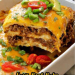 A hearty and flavorful Beef Enchilada Casserole featuring layers of seasoned ground beef, black beans, enchilada sauce, and a blend of cheddar and Monterey Jack cheeses, topped with fresh diced avocado, tomato, cilantro, and jalapeno for a delicious Mexican-inspired baked dish.