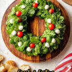 A festive and easy-to-make Caprese Salad Wreath featuring fresh arugula, grape tomatoes, mozzarella pearls, and basil, drizzled with balsamic vinaigrette for a perfect holiday appetizer or side dish.