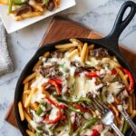 - Assemble the Fries: Place the cooked fries on a serving platter. Top evenly with the caramelized steak, peppers, and onions mixture. Pour the warm cheese sauce generously over the top. Serve any remaining cheese sauce on the side for dipping.
