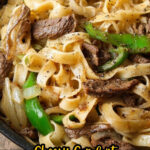 Philly Cheesesteak Pasta combines tender strips of steak, sautéed onions, and green bell peppers tossed with pappardelle pasta in a rich, creamy, and cheesy sauce for a comforting and flavorful dish inspired by the classic Philly cheesesteak sandwich.