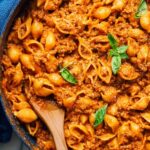 This One-Pot Creamy Beef and Shells recipe is a comforting and hearty dish featuring ground chuck sautéed with onions and garlic, simmered in a rich tomato and beef stock sauce, then combined with tender pasta shells and finished with creamy heavy cream, Pecorino Romano cheese, and fresh basil for a delicious weeknight meal.
