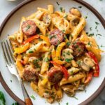 One Pot Creamy Cajun Sausage Pasta is a flavorful and easy-to-make dinner featuring spicy andouille sausage, sautéed vegetables, and a creamy Cajun sauce, all cooked together in one skillet for a comforting and satisfying meal.