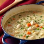 A comforting and creamy chicken casserole made with tender diced chicken breast, vegetables, and a rich cream sauce, baked to perfection and served over mashed potatoes with a sprinkle of fresh parsley.
