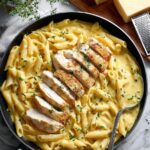 Creamy Skillet Pesto Chicken is a rich and flavorful dish featuring tender boneless chicken breasts coated in a fragrant basil pesto cream sauce with parmesan cheese. This easy-to-make dinner is ready in under 30 minutes and garnished with fresh herbs for a delicious, comforting meal.