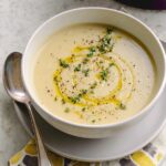 This rich and creamy potato leek soup features sautéed leeks and tender Yukon gold potatoes blended together with vegetable stock and finished with heavy cream for a velvety smooth texture. Perfectly seasoned and garnished with fresh thyme and a drizzle of olive oil, it's a comforting and elegant starter or light meal.