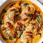 Creamy Tuscan Chicken features tender seared chicken breasts simmered in a rich and flavorful sauce made with heavy cream, sun-dried tomatoes, spinach, garlic, and parmesan. This comforting Italian-inspired dish is perfect for a satisfying dinner that's easy to make and packed with vibrant flavors.