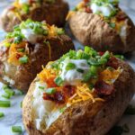 This Air Fryer Baked Potato recipe features perfectly crispy skin and tender insides, topped fully loaded with melted cheddar cheese, crispy turkey bacon, green onions, butter, and sour cream for a delicious, easy-to-make side or main dish.