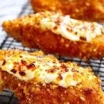 Definitely! Baking is a great option if you want a lighter version. Just toast the seasoned breadcrumbs first, coat the chicken, then bake at 220C/430F for 10 minutes, flip and bake another 8-10 minutes until crisp and cooked through. Finish under the grill with the feta topping as usual.