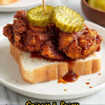 Nashville Hot Chicken is a fiery, crispy fried chicken recipe featuring a spicy cayenne pepper hot oil mixture brushed over double-dredged, buttermilk-soaked chicken. Served on white bread with pickles, this Southern classic is perfect for those craving bold, spicy flavors and a crunchy crust.