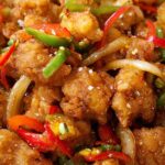 Salt and Chilli Chicken is a flavorful and crispy Chinese-inspired dish featuring marinated chicken thighs coated in a crunchy cornflour batter, stir-fried with aromatic garlic, vibrant peppers, and fiery bird’s eye chillies. Perfect as a delicious main course, this recipe combines the richness of sesame oil and fragrant Chinese 5 spice with a satisfying crunchy texture.