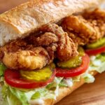 This Shrimp Po' Boy Recipe features crispy fried medium shrimp seasoned with a blend of spices, piled high on a classic French baguette, and slathered with a tangy Creole-style remoulade sauce. Garnished with dill pickles, shredded iceberg lettuce, and sliced tomatoes, it's a flavorful and satisfying sandwich perfect for lunch or dinner.