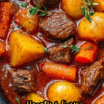 This Easy Homemade Beef Stew features tender beef chuck chunks slow-cooked with hearty carrots and Yukon gold potatoes in a rich, savory broth seasoned with garlic, onion, tomato paste, and fresh thyme. Perfect for a comforting and satisfying meal.