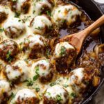 French Onion Meatballs combine juicy ground beef meatballs infused with fresh herbs and cheeses, baked in a rich, caramelized French onion sauce topped with melted Gruyere and mozzarella. This hearty dish makes for an indulgent and comforting main course perfect for family dinners.