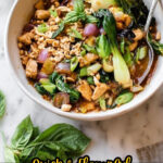 - Garnish and serve: Transfer the stir-fry to a serving platter. Sprinkle the crushed dry-roasted peanuts and torn fresh Thai or traditional basil on top. Serve hot over coconut jasmine rice or cauliflower rice, if desired.