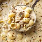 Garlic Parmesan Chicken Chowder is a rich and comforting soup featuring tender chicken, small shell pasta, and a creamy garlicky broth infused with Parmesan and mozzarella cheeses. Perfect for a cozy weeknight dinner, this chowder delivers hearty flavors with a smooth, cheesy finish.