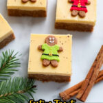 - Chill and Serve: Refrigerate the bars for at least 2 hours or overnight to fully set. Remove from the pan using the parchment paper sling and cut into 12 bars. Garnish with mini gingerbread cookies or sprinkles if desired before serving.