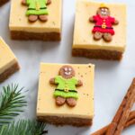 - Chill and Serve: Refrigerate the bars for at least 2 hours or overnight to fully set. Remove from the pan using the parchment paper sling and cut into 12 bars. Garnish with mini gingerbread cookies or sprinkles if desired before serving.