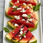 - Assemble and Serve: Arrange the grilled watermelon on a serving platter and sprinkle with crumbled feta cheese and torn basil leaves. Serve immediately for best flavor.