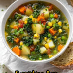 A comforting and healthy vegetable soup packed with seasoned vegetables, kale, peas, and fresh herbs simmered in a flavorful broth. Perfect for a cozy meal that is vibrant and nourishing.