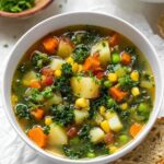 A comforting and healthy vegetable soup packed with seasoned vegetables, kale, peas, and fresh herbs simmered in a flavorful broth. Perfect for a cozy meal that is vibrant and nourishing.