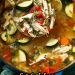 - Finish the soup: Add the canned diced tomatoes, sliced zucchini, and chicken stock to the pot. Bring to a boil and simmer for 20 minutes or until the potatoes are tender. While the potatoes are cooking, shred the rested chicken and add it back into the soup just to warm through.