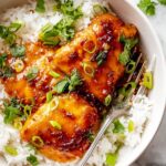 Plate the baked chicken thighs over prepared rice, slather on that sticky sauce, and sprinkle with sliced green onions and fresh cilantro. Finish with a squeeze of lime juice to brighten everything up. I could eat this every week—the balance of sweet, tangy, and garlicky is just unbeatable.