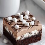 A decadent Hot Chocolate Poke Cake featuring a moist devil's food cake filled with marshmallow fluff soaking into the holes, topped with velvety hot fudge and a creamy hot cocoa whipped topping. Garnished with mini marshmallows and fudge for a delightful dessert that tastes just like a cup of cozy hot chocolate.