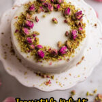 A delicate Persian Love Cake featuring fluffy almond cake layers infused with cardamom, lemon zest, and rosewater, topped with a tangy lemon glaze, pistachios, and dried rose petals for a fragrant and elegant dessert.