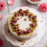 - Assemble Cake: Pour or spread the lemon glaze over the cooled cake layers, then sprinkle with chopped pistachios and dried rose petals for garnish.