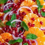 A vibrant and refreshing Mediterranean Orange Salad featuring sweet Navel oranges, pomegranate seeds, fresh mint, and a honey-lime dressing accented with orange blossom water and warm spices. Perfect as a light appetizer or side dish with a burst of fresh flavors.