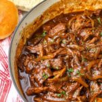 - Serve: Remove from heat and pile the sauced beef and caramelized onion mixture onto sandwich buns. Serve immediately while hot.