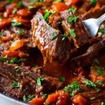 This Simplest Brisket with Braised Onions recipe is a comforting, flavorful dish perfect for a hearty dinner. Featuring a tender 6-pound first-cut beef brisket browned to perfection and slowly braised with sweet yellow onions, garlic, carrots, and rich tomato paste, this recipe yields melt-in-your-mouth meat infused with deep savory flavors. Ideal for feeding a crowd of 8 to 10, the brisket benefits from an overnight rest to enhance tenderness and flavor. Cooked low and slow in the oven, it’s an approachable yet impressive meal for gatherings or special occasions.