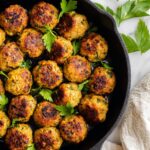 These Greek Chicken Meatballs are flavorful, juicy, and infused with fresh herbs like dill and mint. Perfectly spiced with cumin, oregano, and a hint of lemon zest, they make an excellent main dish served over romaine lettuce alongside feta, cucumber, tomato, white rice, and creamy tzatziki sauce.