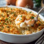 A comforting gluten-free baked shrimp and rice casserole featuring savory herbs, a creamy dill sauce, and tender shrimp nestled in perfectly cooked brown rice. This dish combines the nutty flavor of toasted brown rice with a rich Bechamel-based dill cream sauce and juicy shrimp, baked to golden perfection. Ideal for an elegant dinner or a cozy family meal.
