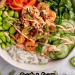 - Assemble the Bowls: Start with a base of fluffy cooked rice or rice-lettuce mix. Top with cucumber, jalapeño, carrots, edamame, and saucy shrimp.