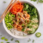 - Assemble the Bowls: Start with a base of fluffy cooked rice or rice-lettuce mix. Top with cucumber, jalapeño, carrots, edamame, and saucy shrimp.