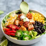 A vibrant and flavorful Southwest Salad packed with seasoned chicken, fresh vegetables, black beans, corn, and topped with a creamy Cilantro Lime Dressing for a delicious and satisfying meal.