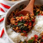 A flavorful and easy-to-make Thai Basil Chicken recipe, known as Gai Pad Krapow, featuring ground chicken stir-fried with aromatic garlic, shallots, and spicy chilies, finished with fresh Thai basil. Perfect served over steamed rice for a quick weeknight meal.