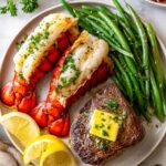 A luxurious Surf and Turf recipe combining buttery lobster tails and perfectly seared filet mignon steaks, topped with a flavorful compound butter for a decadent date night dinner.