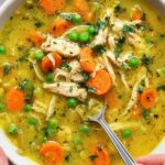 This Anti Inflammatory Turmeric Chicken Soup is a nourishing and flavorful one-pot meal packed with wholesome vegetables, tender chicken, and infused with the healing power of turmeric and warming spices. Perfect for a comforting family dinner or meal prep, this soup combines coconut milk and chicken broth for a creamy yet light texture while keeping it dairy-free, paleo, and gluten-free. The addition of fresh parsley and optional peas adds brightness and color, making it a delicious and nutritious soup for any occasion.