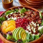 A vibrant and festive winter salad featuring mixed baby greens, fresh citrus, creamy avocado, crunchy pomegranate seeds, salty feta cheese, and candied spiced nuts, all tossed in a sweet and tangy cranberry balsamic dressing. Perfect as a refreshing side or a light main course during the holiday season.